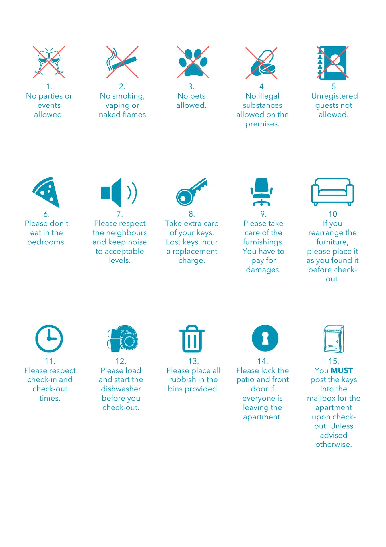 We want you to enjoy your stay whilst respecting our accommodation, we kindly ask you read our house rules below and keep them in mind during your stay, along with the important Fire Prevention Information that was provided earlier in the guide.